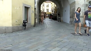 一个女孩在广场上走来走去时露出她的乳房。 公众人士