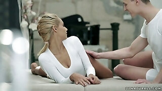 süße schlanke zierliche blonde ballerina zeigt ihre perfekte dehnung, während sie hart gefickt wird