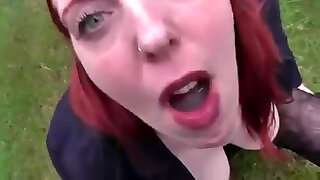 rothaarige deutsche milf bearbeitet diesen riesigen schwanz mit ihrem hintern und mund im park