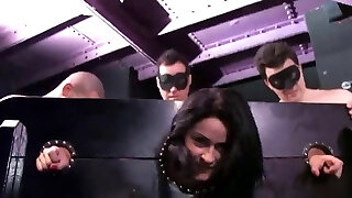 Dark Haired Gets Double Romped and Throat Fucked in Tied up Gangbang