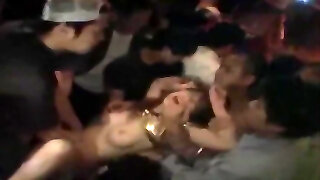 brunette teen in a crazy mega gangbang