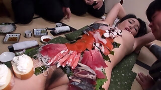 Horny Japanese chick Haruka lets guys eat sushi off her bod