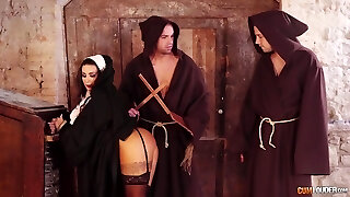 Threesome drilling with a sexy nun ends with a double facial cumshot
