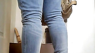 Milky dame in blue jeans and coat pisses in the toilet